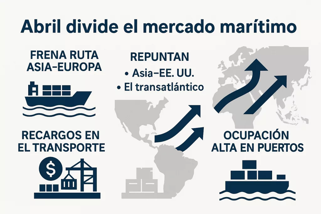 Abril de 2026 no ha traído una normalización general del transporte marítimo, sino un mercado partido en dos. Si la pregunta es qué han hecho de verdad los precios estas semanas, la respuesta es clara: las rutas Asia-Europa han cedido desde el pico de principios de mes, mientras Asia-Estados Unidos y el transatlántico han seguido tensos y, en algunos casos, claramente al alza. Para un importador o exportador en España, esa divergencia importa más que cualquier titular genérico sobre “subidas” o “bajadas”.